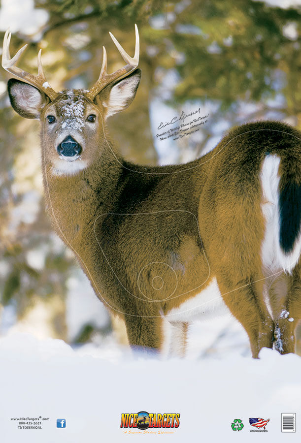 Prepare yourself for your next deer hunt by practicing your quartering away left shot. The hyper-realistic quartering away left target depicts an imposing buck standing in a wooded area drenched in snowfall, presenting new and experienced hunters with a realistic scenario. The nearly invisible kill zone lines help hunters develop their aim and shot. The 40″ x 28″ four-color photo quality print is made from highly durable, weather-resistant plastic and built to hold up against the most severe storms and inclement weather conditions.